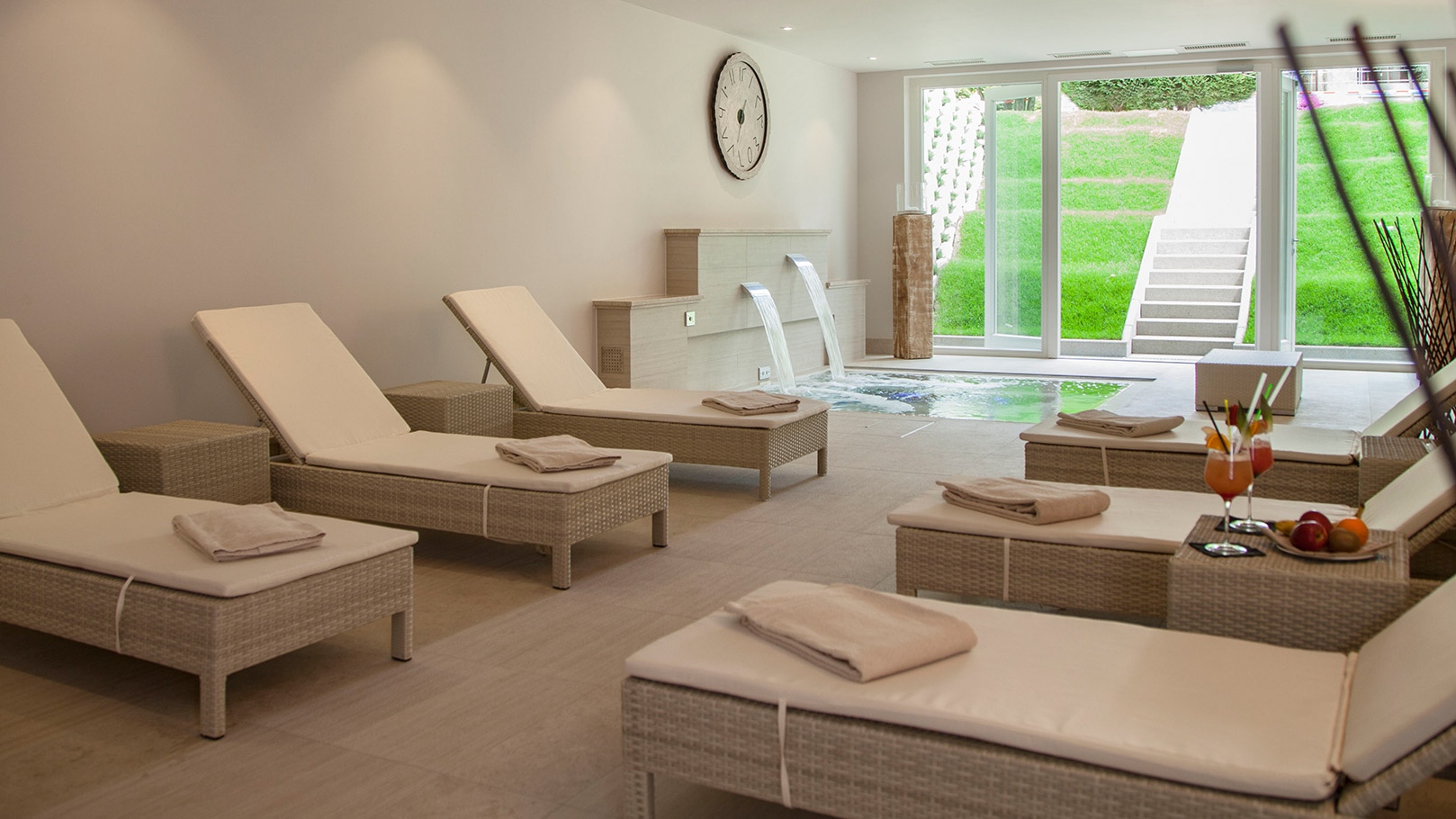 Il y a également une piscine intérieure chauffée (10 × 6 m, ouverte toute l'année) et une piscine extérieure (21 × 9 m, ouverte de mars à octobre environ), un salon de beauté, des cabines de soins et des massages.